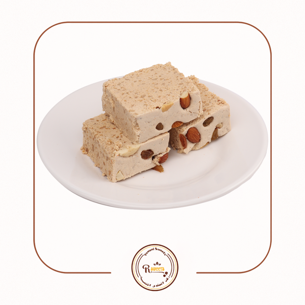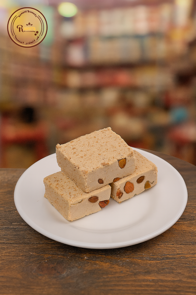 تجسيد للفن والمذاق التقليدي اليمني الأصيل. تمتزج في هذه الحلوى نكهات اللوز الرائعة مع حلاوة السكر، لتكوّن مذاقاً فريداً يأسر القلوب. تضاف إليها لمسات من الدقيق والنشأ، مع زيت الذرة النقي لإضافة نكهة خاصة ومميزة.